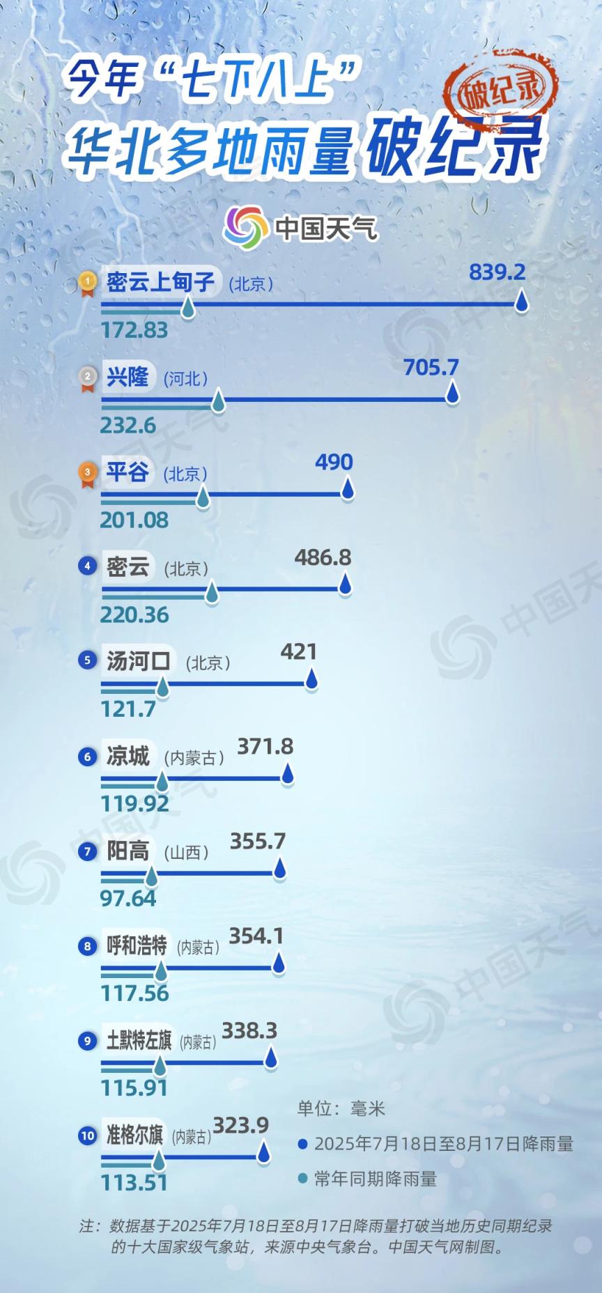 根据中国天气网统计,今年7月18日至8月17日期间北方降雨数据显示,华北等地共出现两次暴雨过程,大部地区累计降水量在100毫米以上。其中,内蒙古河套地区东部至山西北部、河北中北部、北京大部、天津北部累计降水量达250毫米以上,少数地区超过500毫米,降雨量最大的地方是北京密云上甸子,达839.2毫米。